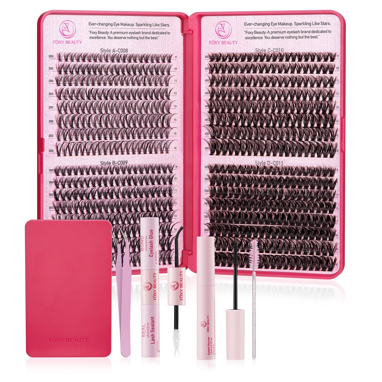 - All-in-One Eyelash Book: Lashes extension kit diy at home by Foxy Beauty provides 640 PCS lash clusters and has an array of lengths and styles, similar to salon lash extensions. Eyelash case*1, lash bond and seal *1, adhesive remover*1, lash tweezers*1, Spoolie Mascara Wand. Everything is prepared for you. Eyelashes Extension Kit is just as lush as expensive salon lash extensions at a fraction of the price. Save time and budget to go to the lash extension salon.