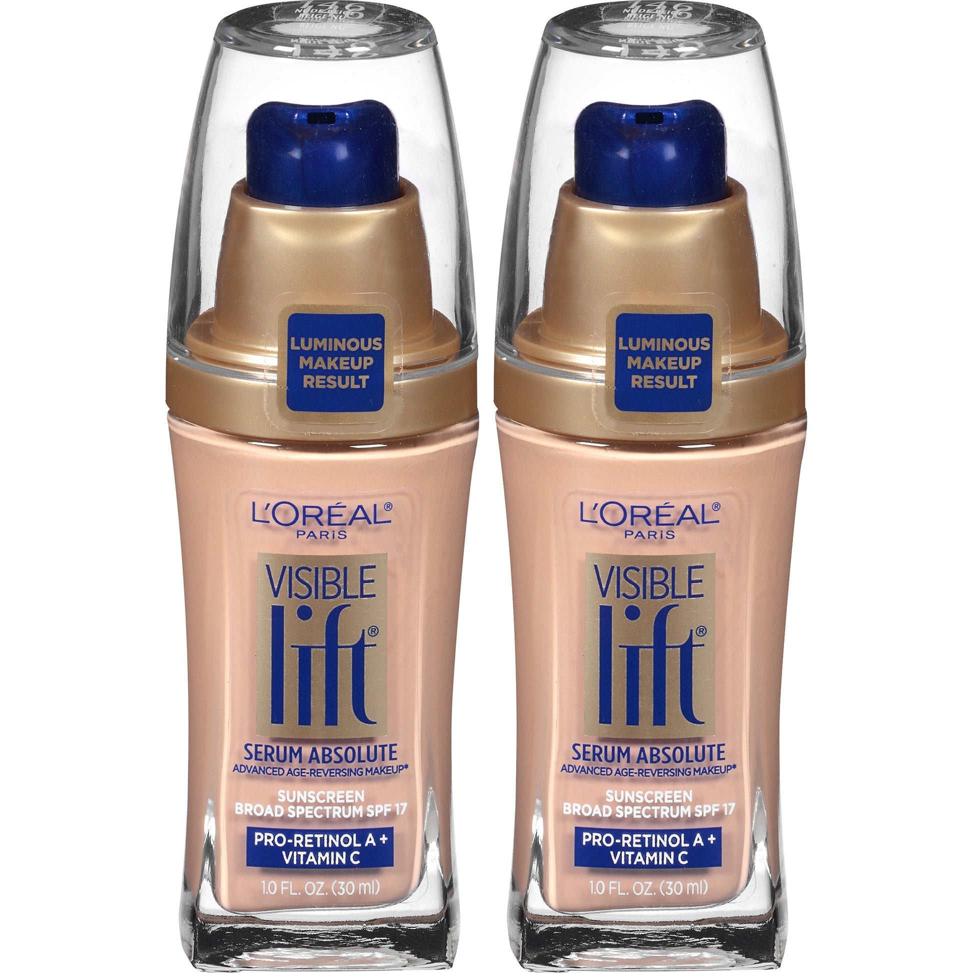 Details: Introducing a breakthrough in age perfecting makeup. Only L'Oreal Paris Visible Lift Serum Absolute Foundation features a serum of 5 ingredients in 1 radiant foundation makeup. Visible Lift Serum Absolute Foundation instantly evens skin tone with a luxuriously lightweight liquid formula that doesn't settle into lines and wrinkles. In four weeks, see skin visibly transform to smoother, brighter, even, and flawless. Visible Lift Serum Absolute is a medium coverage foundation infused with SPF 17. Real women saw visible results: 87% saw more even skin tone. 87% saw minimized imperfections. 79% saw more radiant skin. 68% saw appearance of wrinkles reduced.