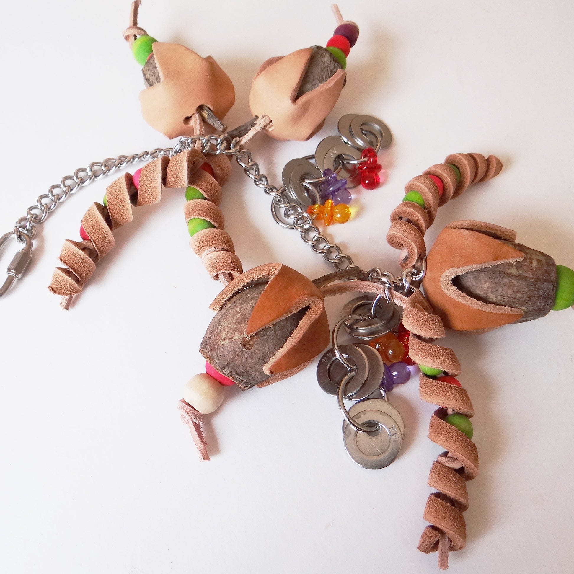 4 large gumnut are wrapped vegetable tanned leather, there are a couple of wooden beads inside nuts for parrot to find surprise when they chew gumnut.