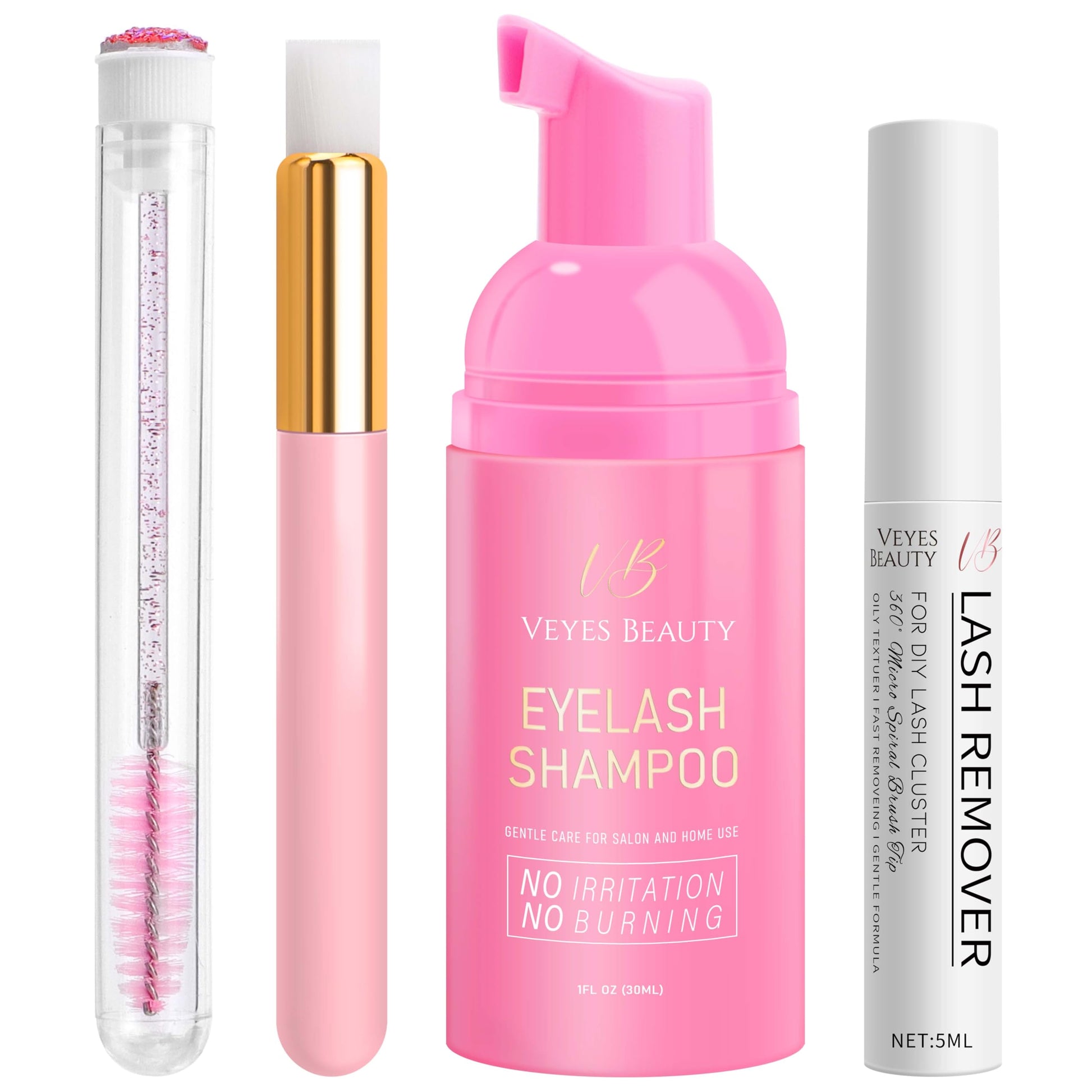 VEYESBEAUTY Cluster Lash Remover & Cleaner Kit DIY Lash Aftecare Kit for Eyelash extensions and Natural Lashes, Remover, Shampoo, Cleansing Brush, Mascara Wand Self-Application Eyelash Cleansing Kit